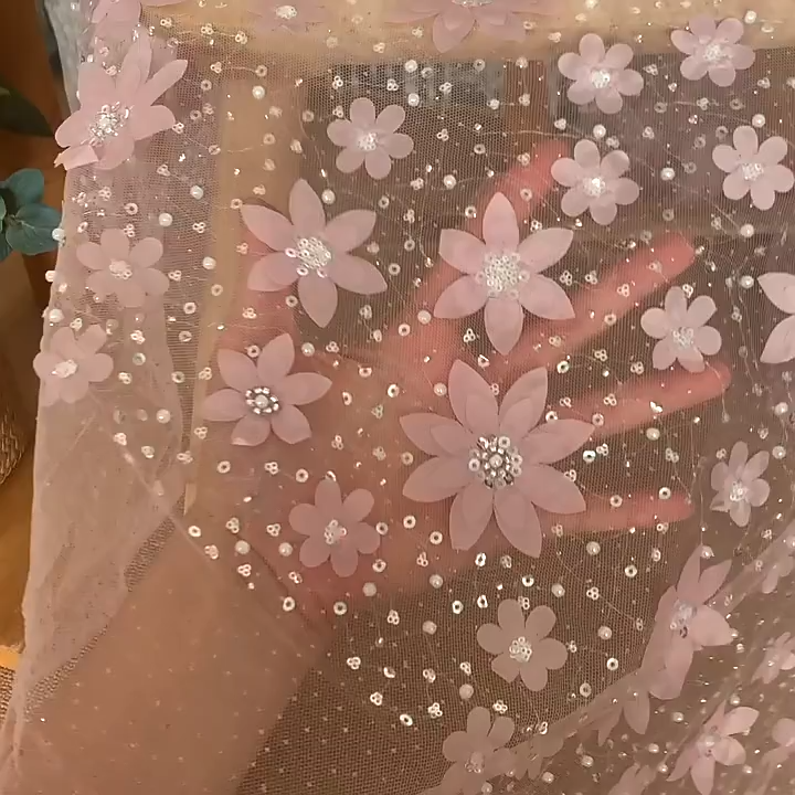 3D Pink Flower Gleaming Tulle Lace Width 150cm TF0119